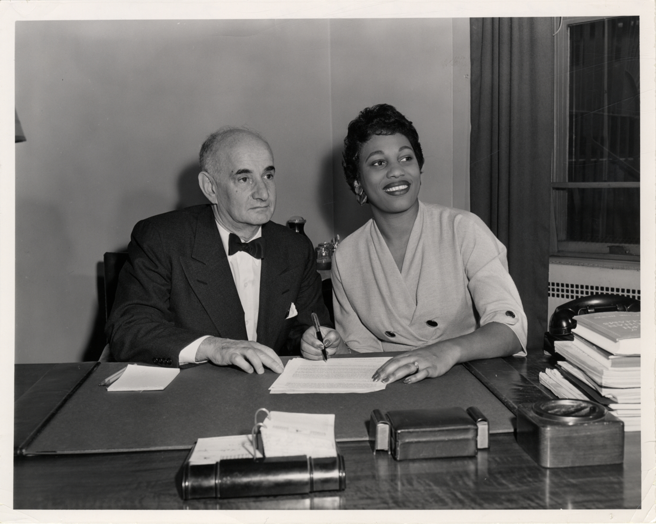 View of soprano Leontyne Price signing document with producer Samuel Chotzinoff. Handwritten on back: "Producer, Samuel Chotzinoff, Miss Price."