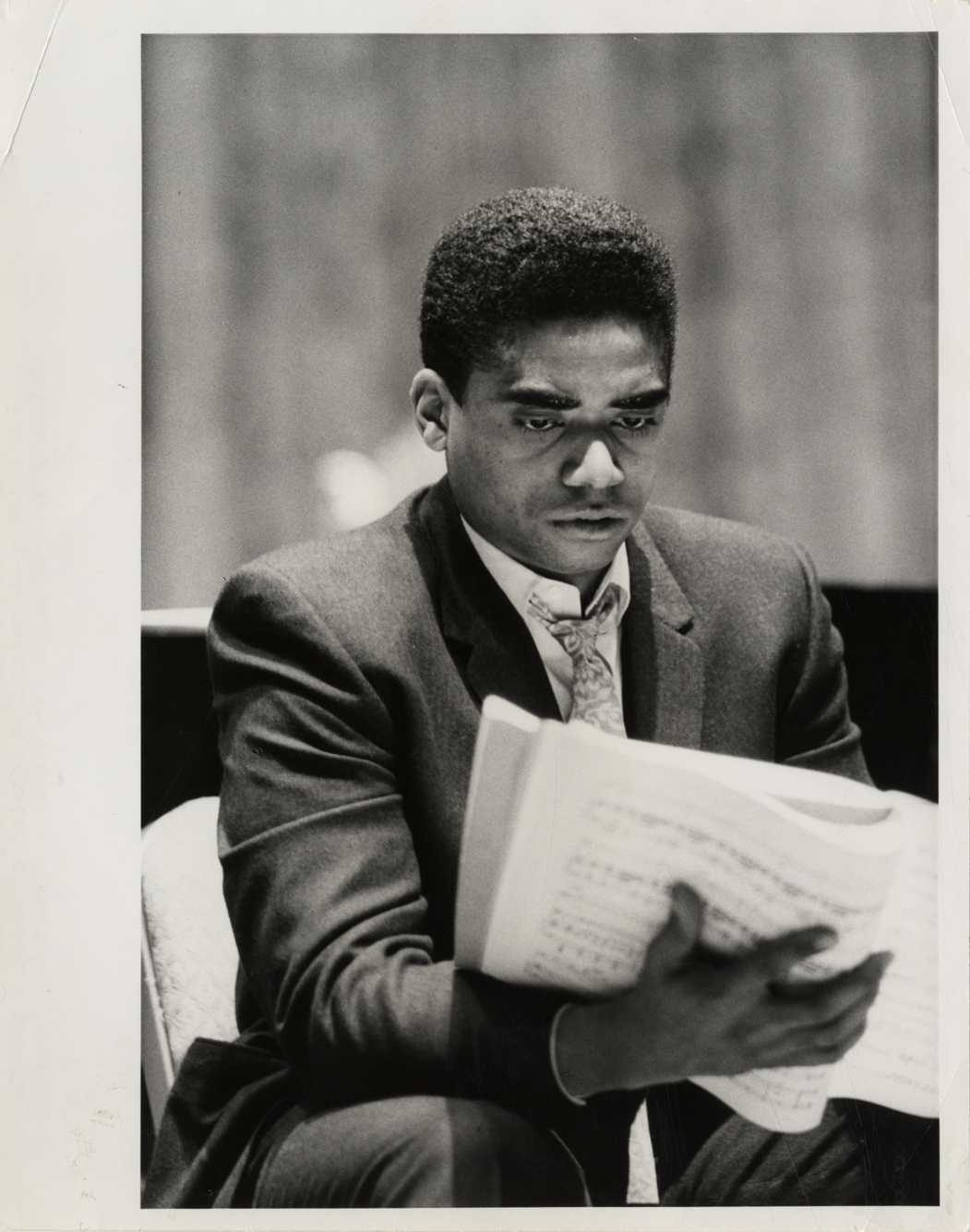 View of tenor George Shirley at recording session of Stravinsky's opera, "Oedipus Rex" for Columbia Records. Label on back: "Recording Stravinsky's 'Oedipus Rex' for Columbia Records in January, 1962, under the composer's direction. This document in sound is one of a series to be released soon in connection with the observance of Stravinsky's eightieth birthday. Mr. Shirley first sang this demanding role at Wayne University in 1955; he is scheduled to repeat it several times this summer during the Santa Fe Opera's Stravinsky Festival. The Jocasta of the recording is Shirley Verrett-Carter who will be the Carmen to Mr. Shirley's Don Jose at Spoleto in the early part of this summer." Typed on back: "George Shirley at recording session of Oedipus Rex for Columbia Records under Stravinsky's direction, January, 1962."