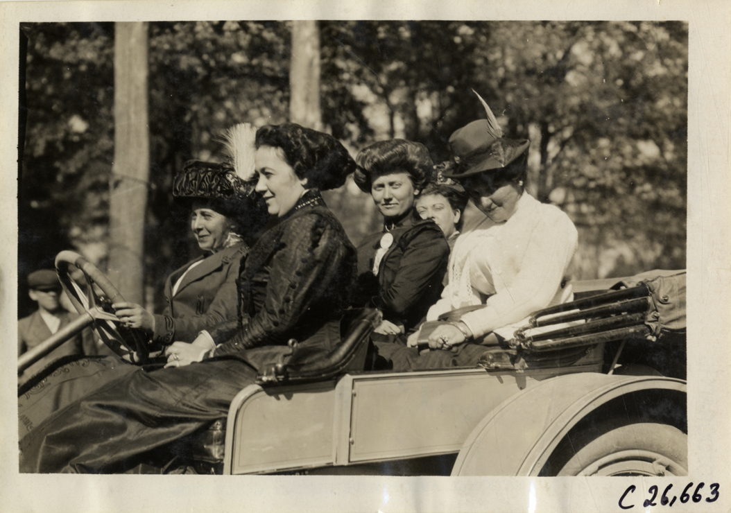 Joan Cuneo and women passengers in automobile, 1909 New York-Atlanta Good Roads Tour