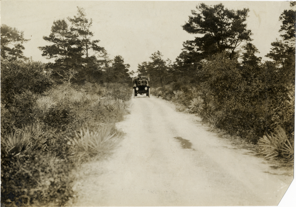View of motorists in 1905 Model "E" White Steamer car traveling on rural dirt road in Florida. Stamped on back: "Photo by N. Lazarnick, 29 West 42nd Street, New York." Handwritten on back: "This was one of six cars that toured in Florida after the Ormond-Daytona races and just before leaving for the Cuba Race. The date was Feb. 2, 1906. White Steamer, 1905. Model E."