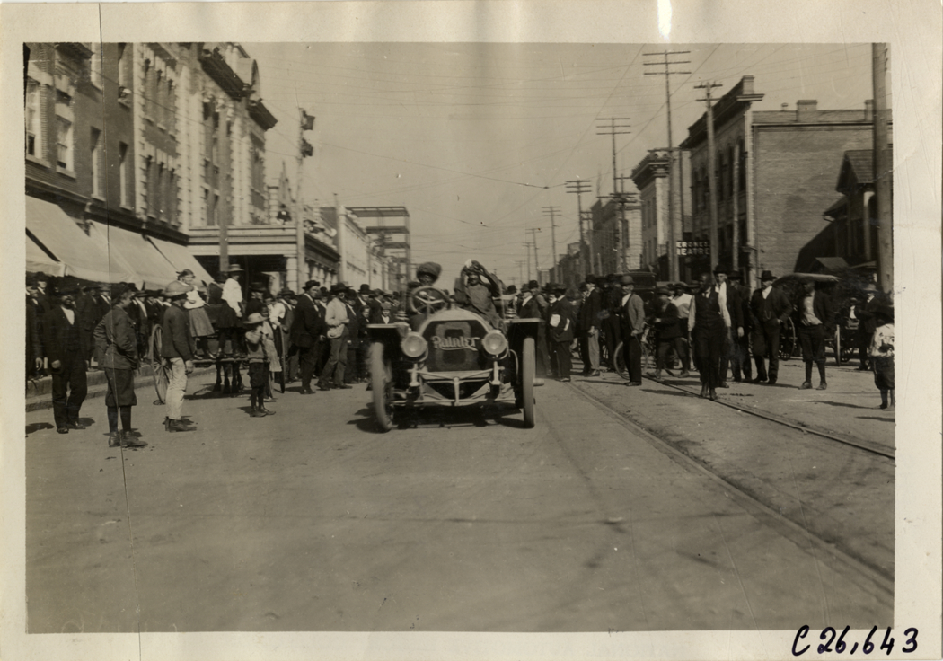 View of Joan Cuneo and motorists posing in Rainier press car, surrounded by spectators, during the 1909 New York to Atlanta Good Roads Tour. Commercial buildings in background. Stamped on back: "Photo by Spooner & Wells, Inc. 1931 Broadway, N.Y." Handwritten on back: "Tours--New York-Atlanta Good Roads Tour, 1909."