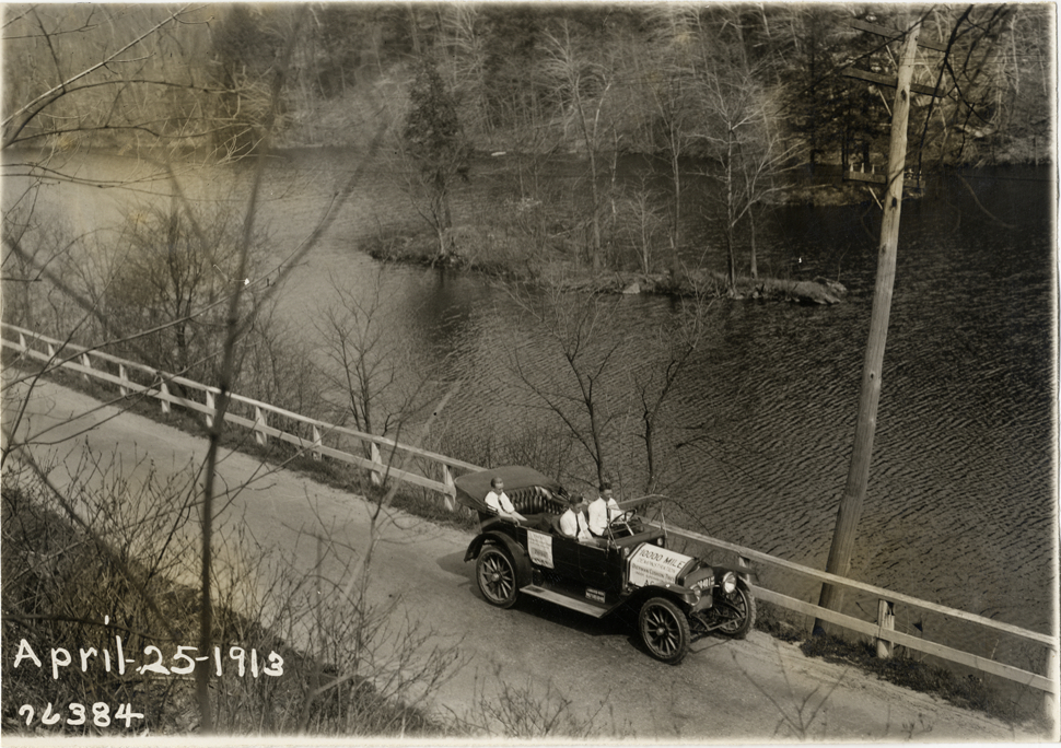 View of motorists in National car traveling on road next to river during the 1913 Overman tires 10,000 mile demonstration. The car was outfitted with a set of Overman cushion tires and driven over different routes and road surfaces within a 50 mile radius of New York, New York. Printed on front: "April-25-1913." Stamped on back: "Spooner & Wells, Inc., photographers, 1931 Broadway, N.Y. City, phones 3472-3473 Col." Handwritten on back: "Tours--Overman tires 10,000 mile demonstration, 1913."