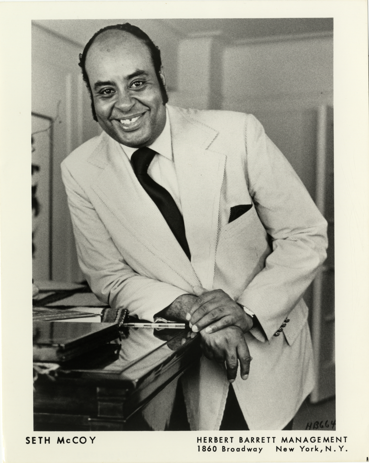 Portrait of tenor Seth McCoy. Printed on front: "Seth McCoy. Herbert Barrett Management, 1860 Broadway, New York, N.Y."