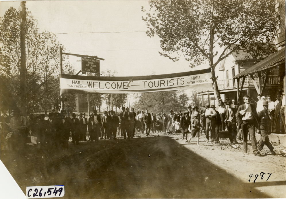 Spectators standing under banner, 1909 New York-Atlanta Good Roads Tour