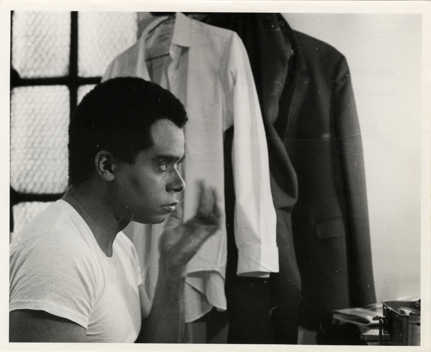View of tenor George Shirley in dressing room before a performance of Mozart's opera, "Don Giovanni." Typed on back: "George Shirley, Masonic Auditorium, May 1966 before 'Don Giovanni' performance. Photo by Lester Sloan."