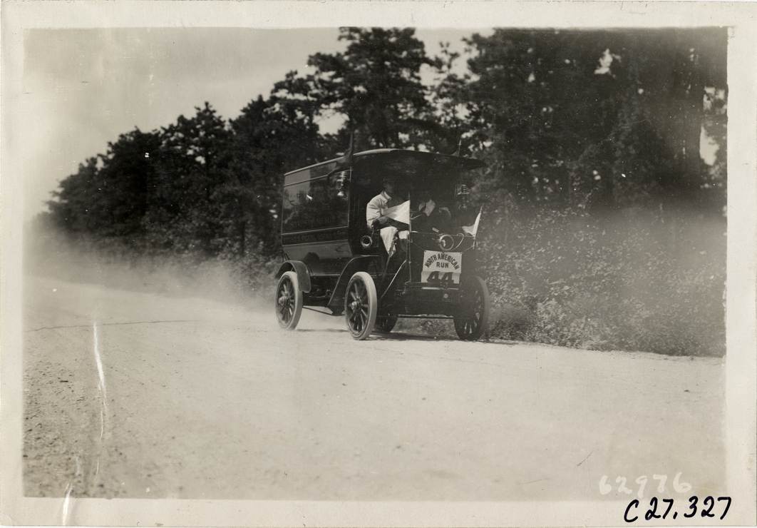 View of motorists in Autocar truck no. 44 traveling on rural dirt road during the 1910 North American Run. The reliability contest for commercial vehicles covered a route from Philadelphia to Atlantic City. Stamped on back: "Spooner & Wells, Inc., photographers, telephones 3472-3473 Columbus, 1931 Broadway, New York." Handwritten on back: "Youngs, Autocar #44 on road to Atlantic City. Tours--North American Run, 1910."