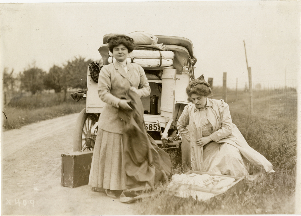 Blanche Stuart Scott and Miss Phillips packing suitcase on roadside, 1910 New York to San Francisco tour