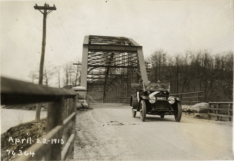 View of motorists in National car crossing bridge during the 1913 Overman tires 10,000 mile demonstration. The car was outfitted with a set of Overman cushion tires and driven over different routes and road surfaces within a 50 mile radius of New York, New York. Printed on front: "April-22-1913." Stamped on back: "Spooner & Wells, Inc., photographers, 1931 Broadway, N.Y. City, phones 3472-3473 Col." Handwritten on back: "Tours--Overman tires 10,000 mile demonstration, 1913."