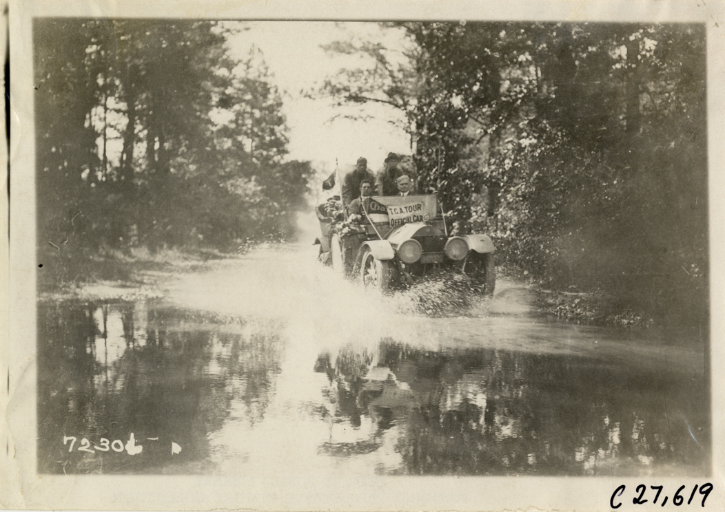 View of motorists in Chalmers car fording a stream during the 1911 Good Roads Tour sponsored by the Touring Club of America. "T.C.A. Tour, official car" sign is displayed on car windshield. The tour covered a route from Atlanta, Georgia to Richmond, Virginia. Stamped on back: "Spooner & Wells, Inc., photographers, telephones 3472-3473 Columbus, 1931 Broadway, New York." Handwritten on back: "Tours--Touring Club of America tour, 1911."