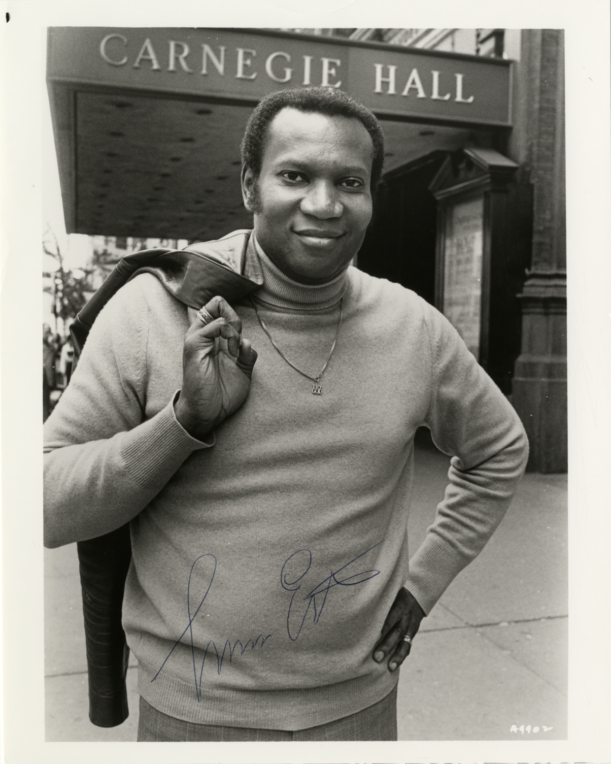 Portrait of bass-baritone Simon Estes, standing in front of Carnegie Hall. Autographed on front: "Simon Estes." Label on back: "Simon Estes, bass-baritone. Columbia Artists Management Inc. 165 West 57th St., N.Y., N.Y. 10019."