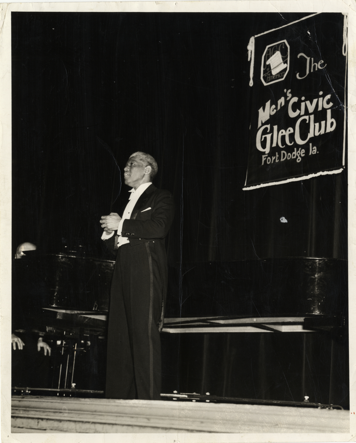 View of tenor Roland Hayes, performing at the Men's Civic Glee Club in Fort Dodge, Iowa. Piano in background. Banner in background reads: "AGC of America. The Men's Civic Glee Club, Fort Dodge, Ia." Handwritten on back: "Roland Hayes."
