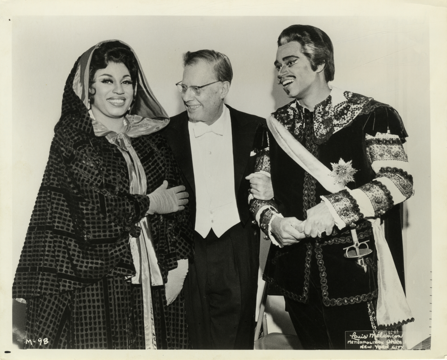 View of soprano Leontyne Price, conductor Karl Bohm and tenor George Shirley posing during a production of Mozart's opera, "Don Giovanni." Printed on front: "Louis Melancon, Metropolitan Opera, New York City." Handwritten on back: "Leontyne Price, Karl Bohm, George Shirley. Don Giovanni. Metropolitan Opera, 1966-67."
