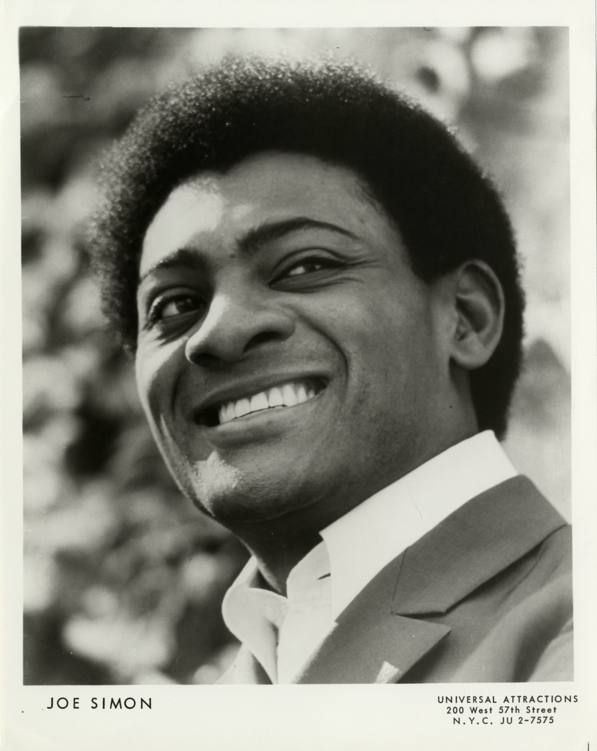 Portrait of singer Joe Simon. Printed on front: "Joe Simon. Universal Attractions, 200 West 57th Street, N.Y.C. JU 2-7575." Handwritten on back: "Simon."