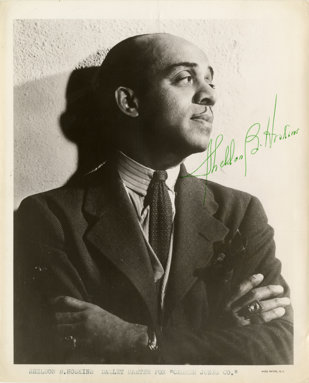 Portrait of dancer Sheldon B. Hoskins. Autographed on front: "Sheldon B. Hoskins." Typed on front: "Sheldon B. Hoskins, ballet master for 'Carmen Jones Co.'" Printed on front: "Moss Photo, N.Y."