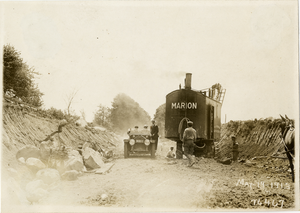 View of motorists in National car passing Marion steam shovel on dirt road during the 1913 Overman tires 10,000 mile demonstration. Road construction workers on right. The car was outfitted with a set of Overman cushion tires and driven over different routes and road surfaces within a 50 mile radius of New York, New York. Printed on front: "May-19-1913." Stamped on back: "Spooner & Wells, Inc., photographers, 1931 Broadway, N.Y. City, phones 3472-3473 Col." Handwritten on back: "Tours--Overman tires 10,000 mile demonstration, 1913."