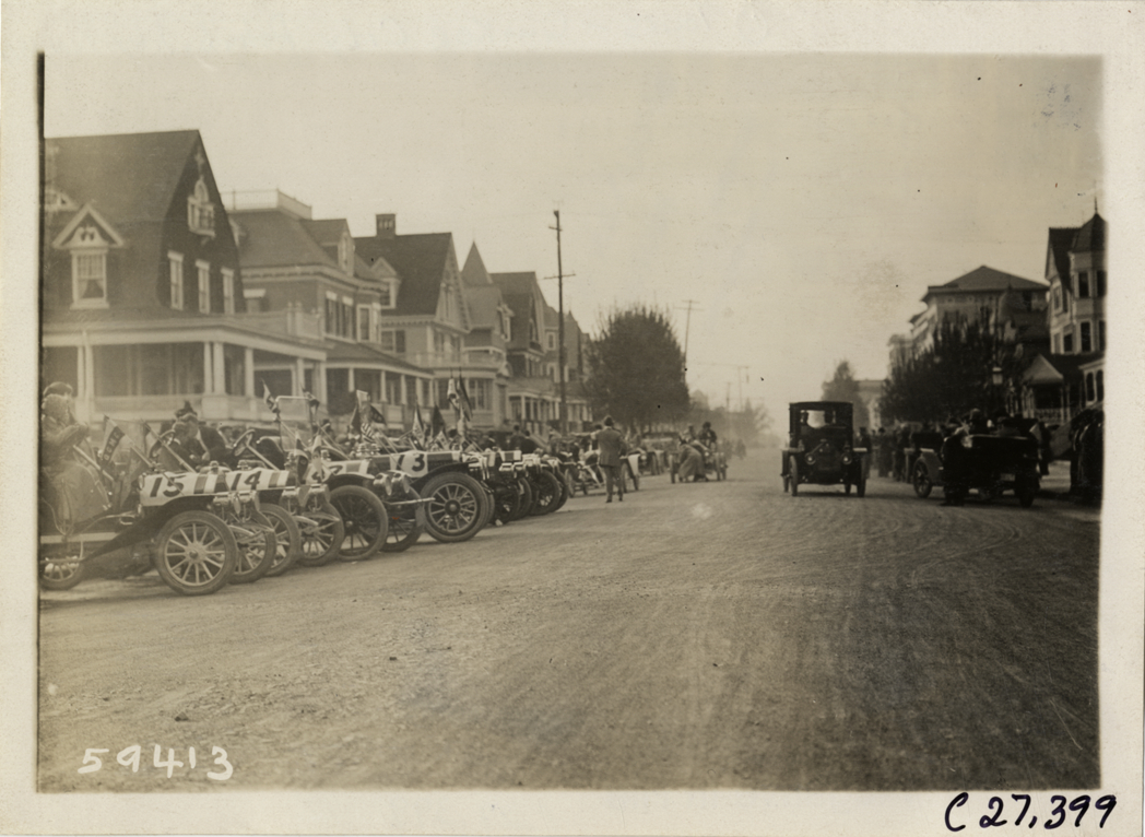 View of cars lined up on residential street during the 1910 Quaker City Motor Club Roadability Run. The endurance contest covered a route from Philadelphia, Pennsylvania to Atlantic City, New Jersey. Stamped on back: "Spooner & Wells, Inc., photographers, telephones 3472-3473 Columbus, 1931 Broadway, New York." Handwritten on back: "Tours--Quaker City Motor Club Roadability Run, 1910."