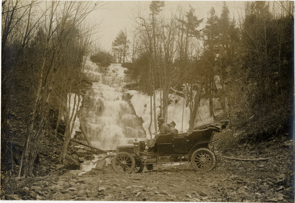 Motorists in 1905 White Steamer automobile in front of waterfall