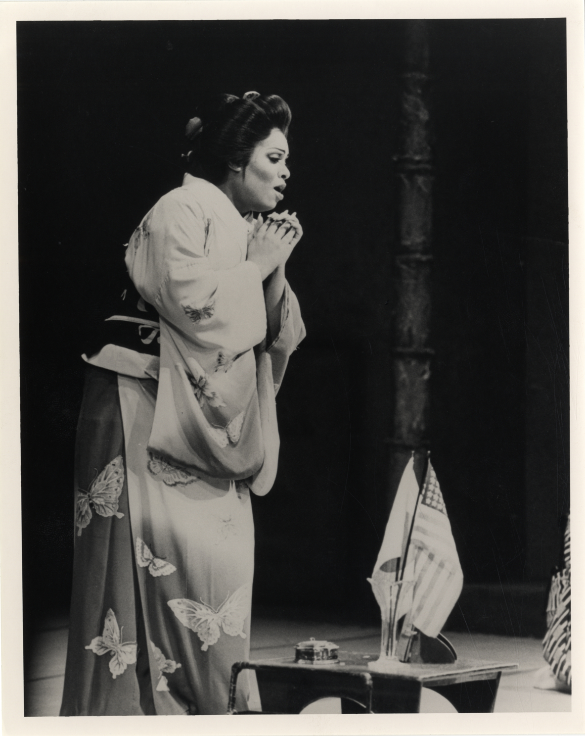 View of soprano Leona Mitchell in Puccini's opera, "Madame Butterfly." Label on back: "Los Angeles Music Center Opera, Leona Mitchell as Butterfly. Credit: J. Heffernan. 135 North Grand Avenue, Los Angeles, California 90012, 213-972-7219."