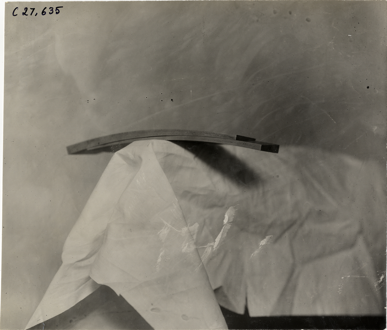 View of segment of Dow rim displayed on dropcloth. Handwritten on back: "Wheels, Dow rim, 1909."
