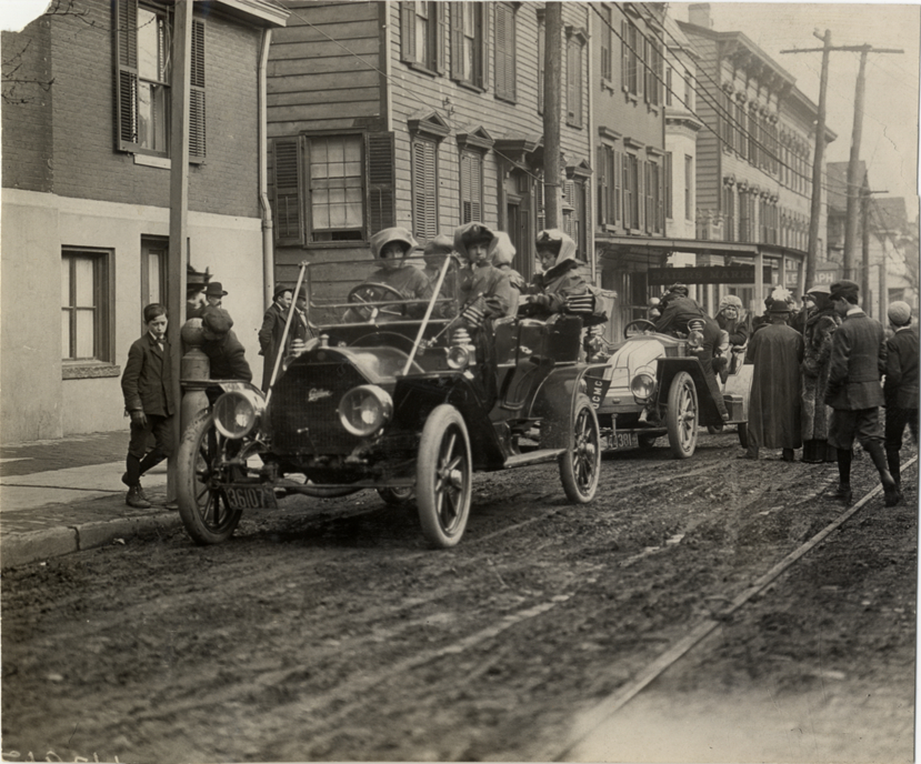 Motorists in Cadillac automobile, 1909 Women's Motoring Club New York to Philadelphia Run
