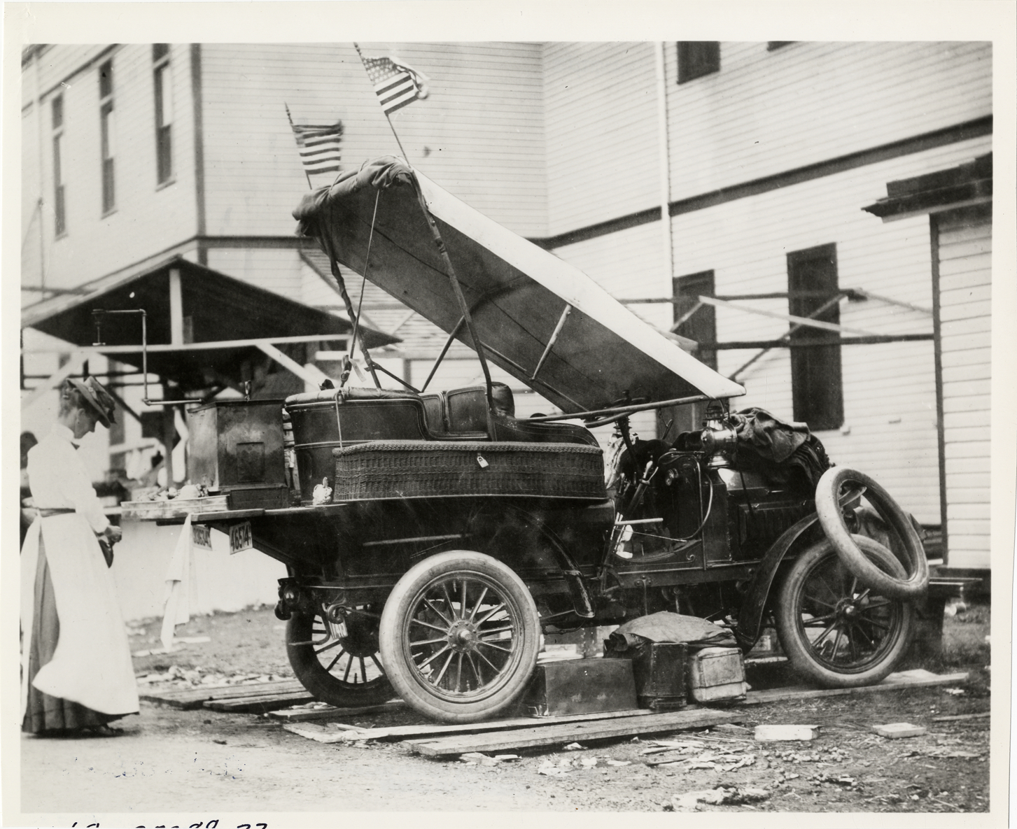 Automobile converted for use as refreshment stand, 1907 Morris Park races