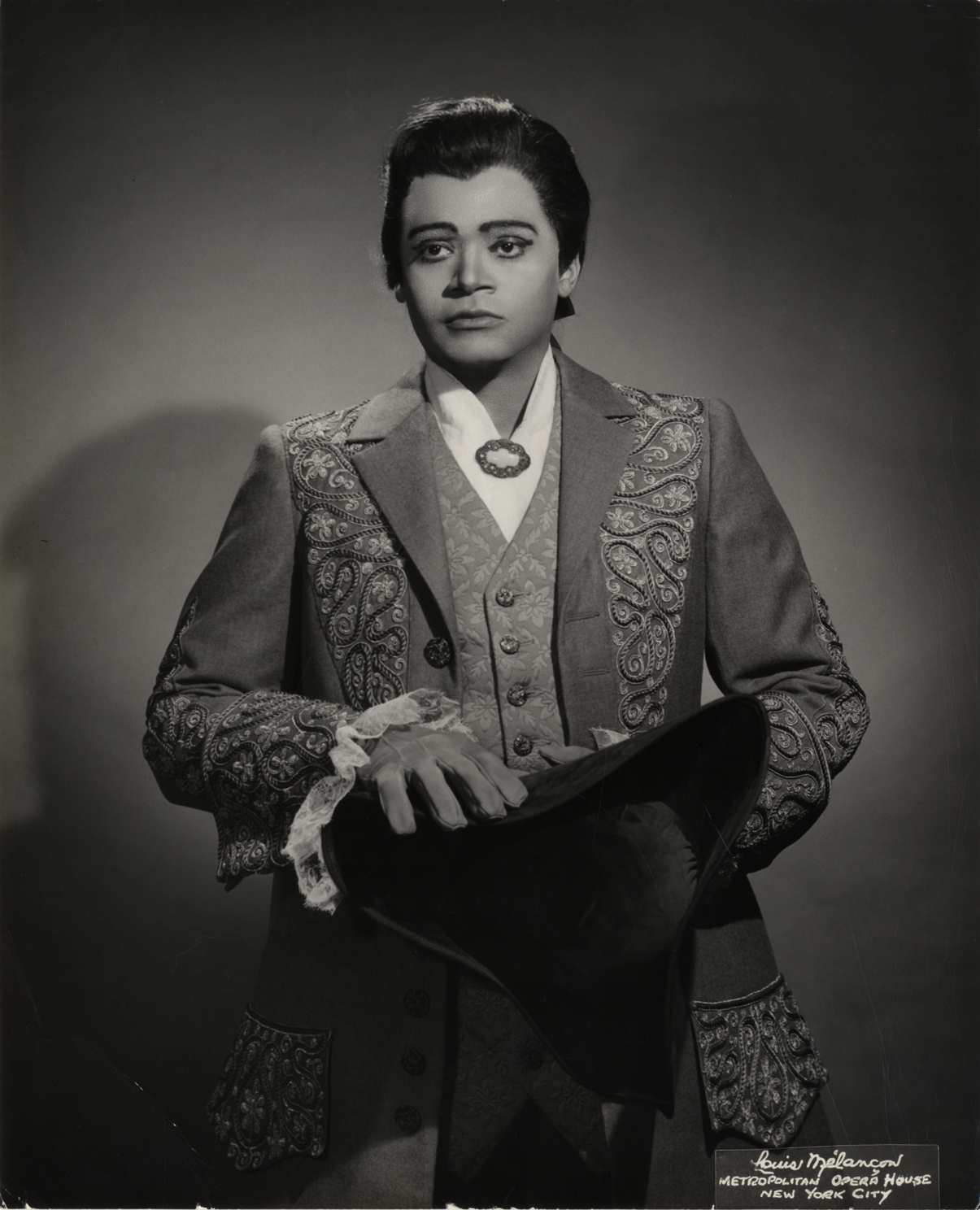 Portrait of tenor George Shirley as Chevalier des Grieux in Massenet's opera, "Manon." Printed on front: "Louis Melancon. Metropolitan Opera house, New York City." Stamped on back: "The use of this photograph is granted with the understanding that it is for your publication only, and will not be syndicated, rented, loaned, or used for advertising purposes without written permission. When published, the customary credit line will be appreciated with the name in full: Louis Melancon. Louis Melancon, New York, N.Y." Handwritten on back: "George Shirley, des Grieux in Manon."