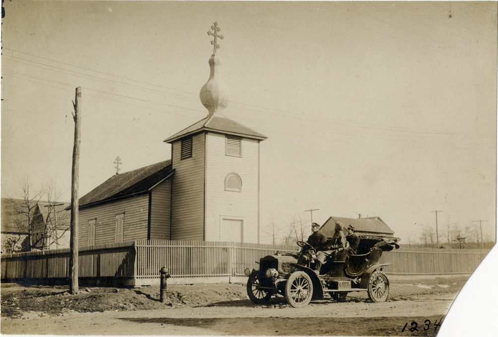 View of motorists in 1905 White Steamer car in front of a wooden-frame Orthodox church building. Handwritten on back: "White Steamer, 1905."