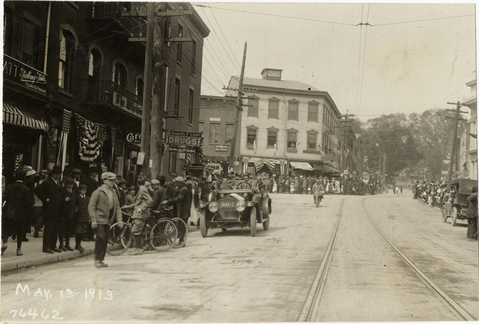 View of motorists in National car passing spectators lined up on sidewalks during the 1913 Overman tires 10,000 mile demonstration. Commercial buildings in background. The car was outfitted with a set of Overman cushion tires and driven over different routes and road surfaces within a 50 mile radius of New York, New York. Printed on front: "May-13-1913." Stamped on back: "Spooner & Wells, Inc., photographers, 1931 Broadway, N.Y. City, phones 3472-3473 Col." Handwritten on back: "Tours--Overman tires 10,000 mile demonstration, 1913."