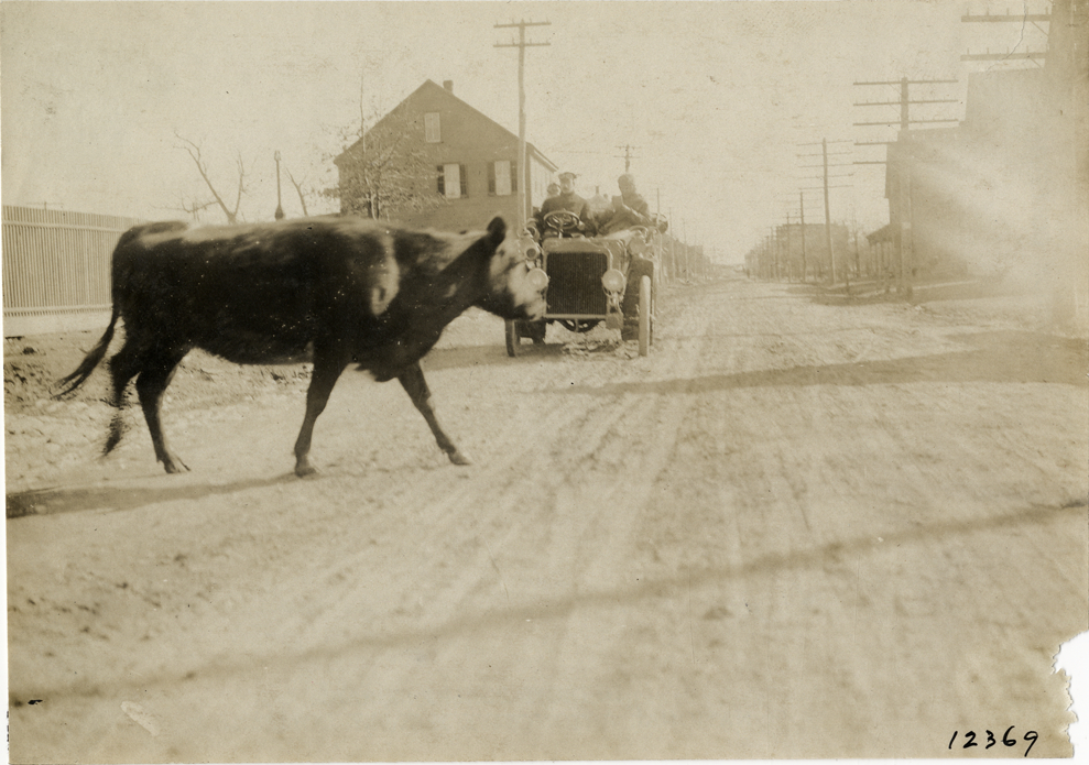 View of motorists in 1905 White Steamer car waiting for a cow to cross road. Houses in background. Handwritten on back: "White Steamer, 1905."