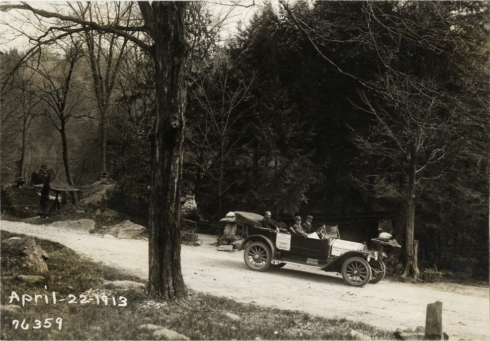 View of motorists posing in National car on forest road during the 1913 Overman tires 10,000 mile demonstration. The car was outfitted with a set of Overman cushion tires and driven over different routes and road surfaces within a 50 mile radius of New York, New York. Printed on front: "April-22-1913." Stamped on back: "Spooner & Wells, Inc., photographers, 1931 Broadway, N.Y. City, phones 3472-3473 Col." Handwritten on back: "Tours--Overman tires 10,000 mile demonstration, 1913."