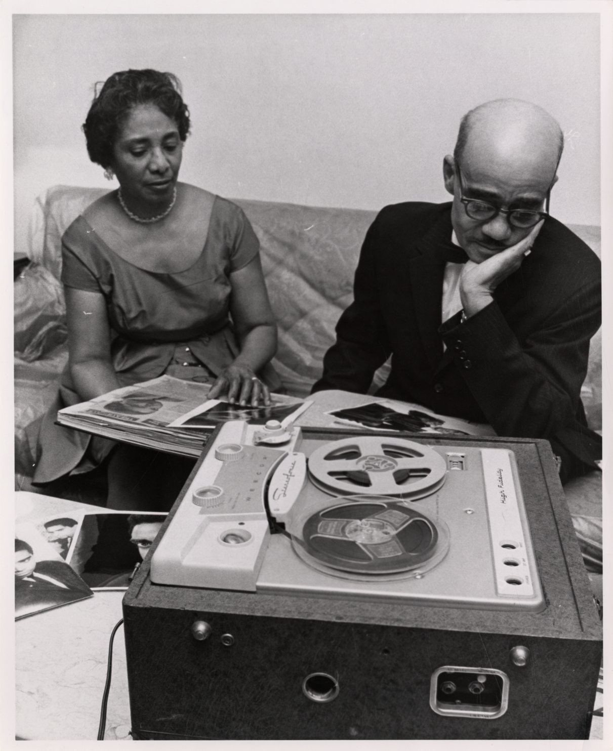 View of Irving and Daisy Shirley, parents of tenor George Shirley, sitting on sofa and looking at photographs of George Shirley. Tape recorder on table in foreground. Stamped on back: "Photography by Fred A. Plofchan." Handwritten on back: "Mr. and Mrs. Irving Shirley, parents of George Shirley, 1963."