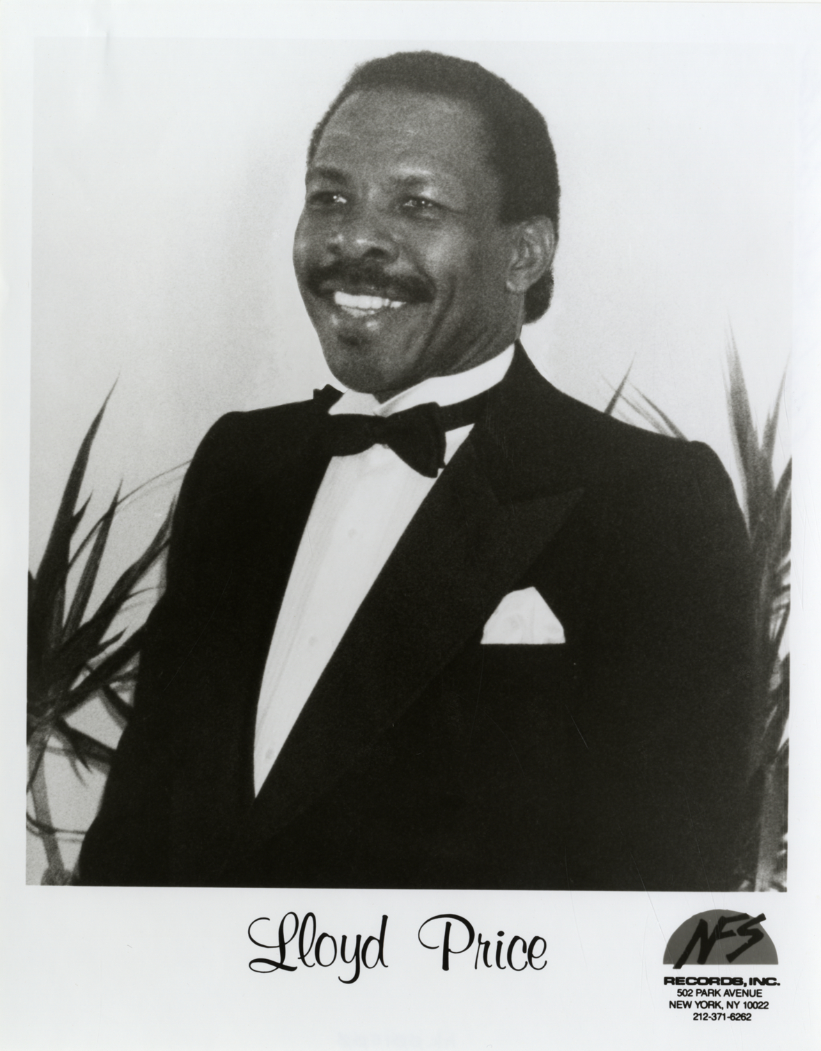 Portrait of singer Lloyd Price. Printed on front: "Lloyd Price. NFS Records, Inc., 502 Park Avenue, New York, NY 10022, 212-371-6262."
