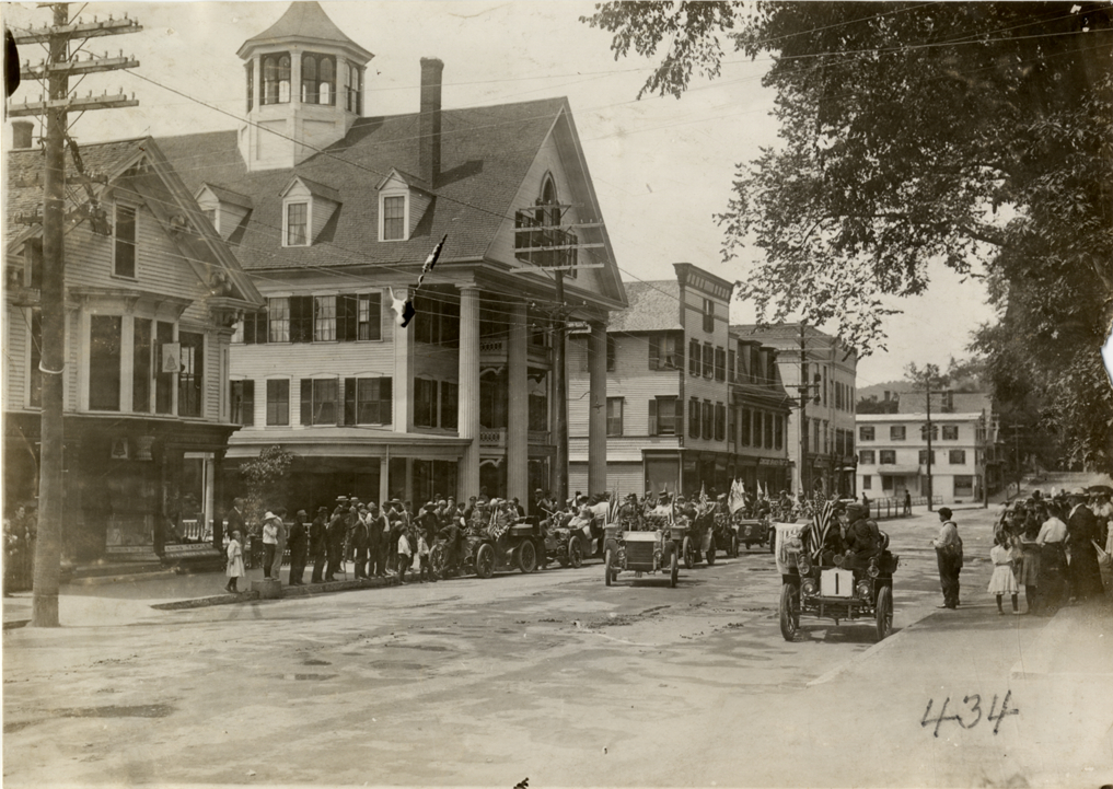 Automobiles and spectators in front of Thayer's Inn at Littleton, New Hampshire, 1904 White Mountains tour