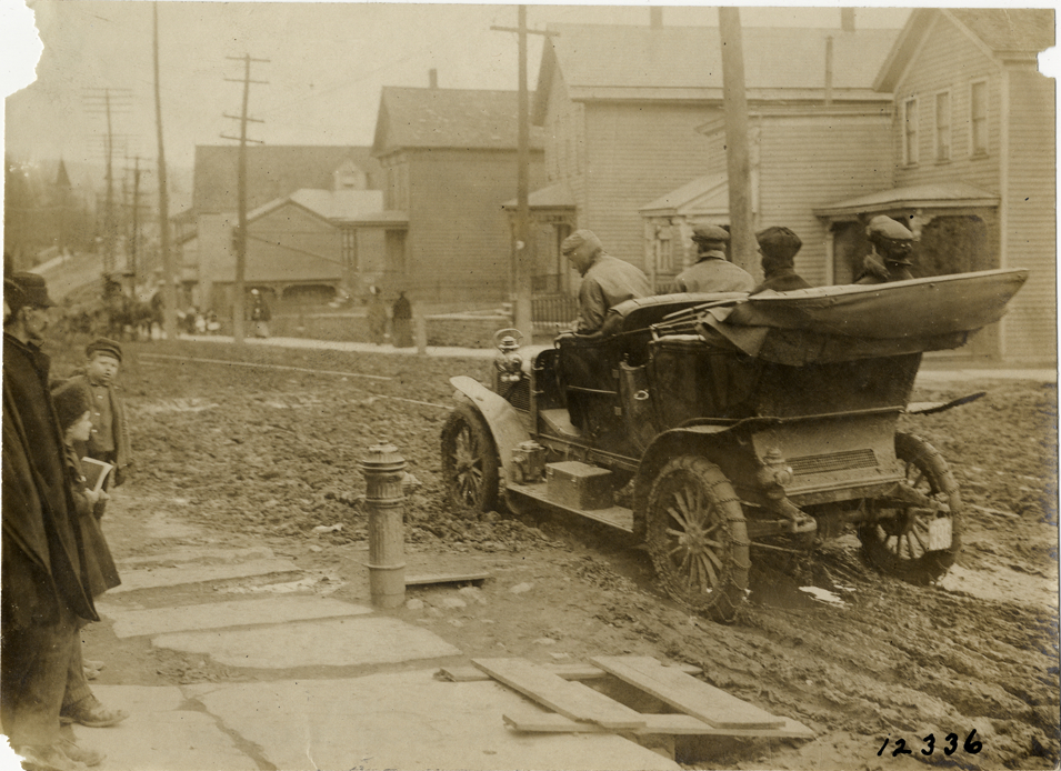 View of motorists in 1905 White Steamer car traveling on muddy street. Wooden-frame houses in background. Handwritten on back: "White Steamer, 1905."