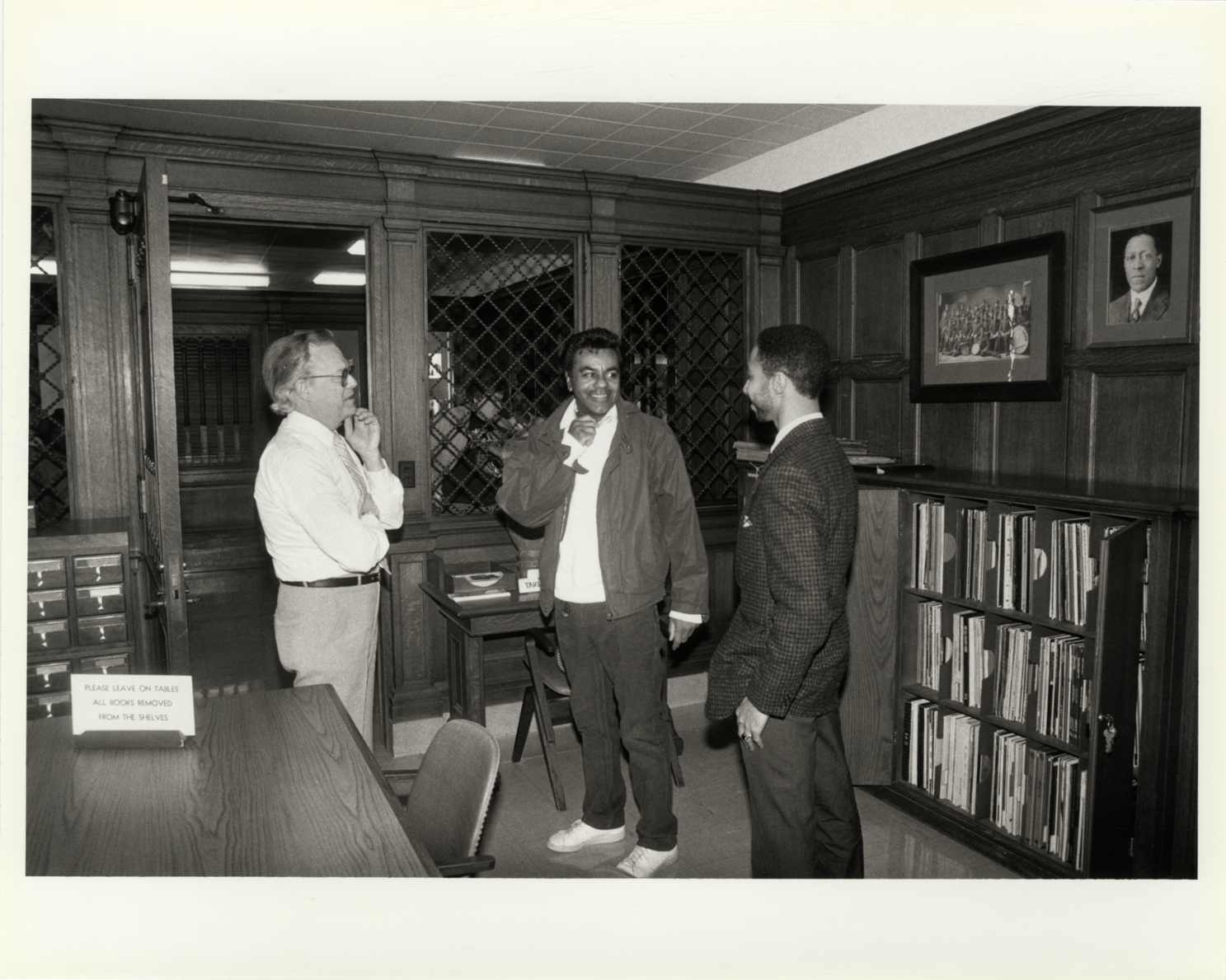 View of singer Johnny Mathis speaking with Maurice Wheeler and Paul Sculpholm at the E. Azalia Hackley Collection of the Detroit Public Library.