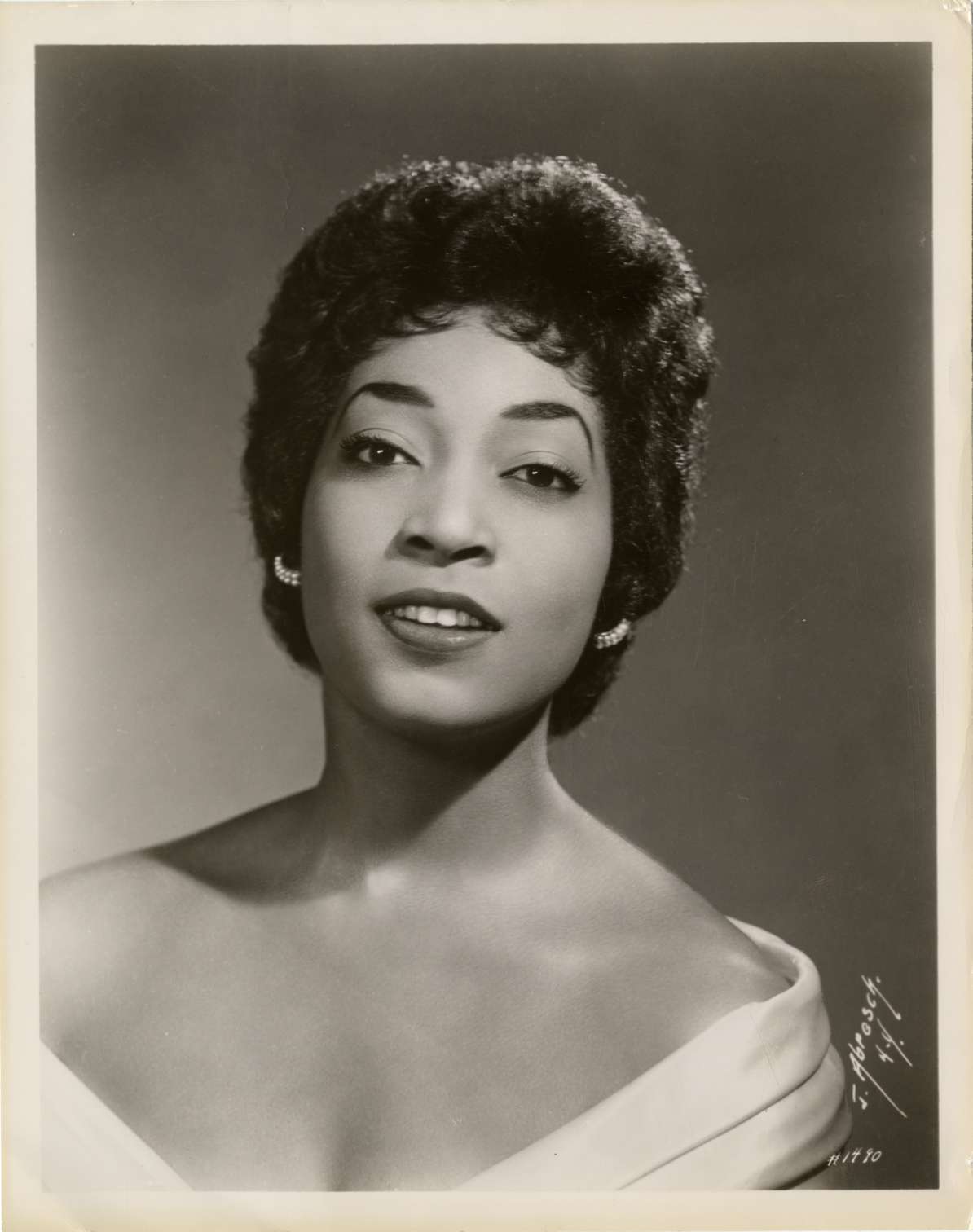 Portrait of soprano Gloria Davy. Printed on front: "J. Abresch, N.Y." Stamped on back: "Gloria Davy, soprano."