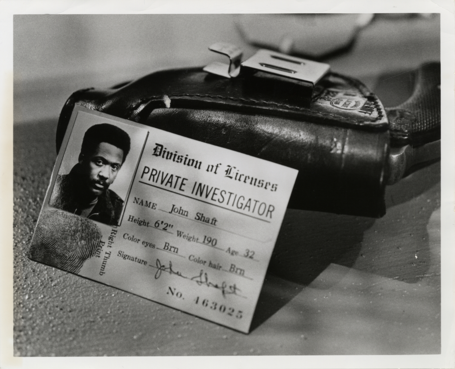 Private investigator license with photograph of Richard Roundtree, as John Shaft