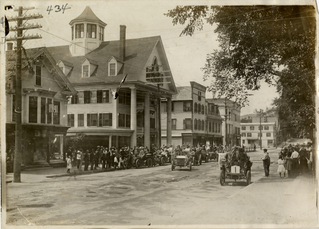Automobiles and spectators in front of Thayer's Inn at Littleton, New Hampshire, 1904 White Mountains tour