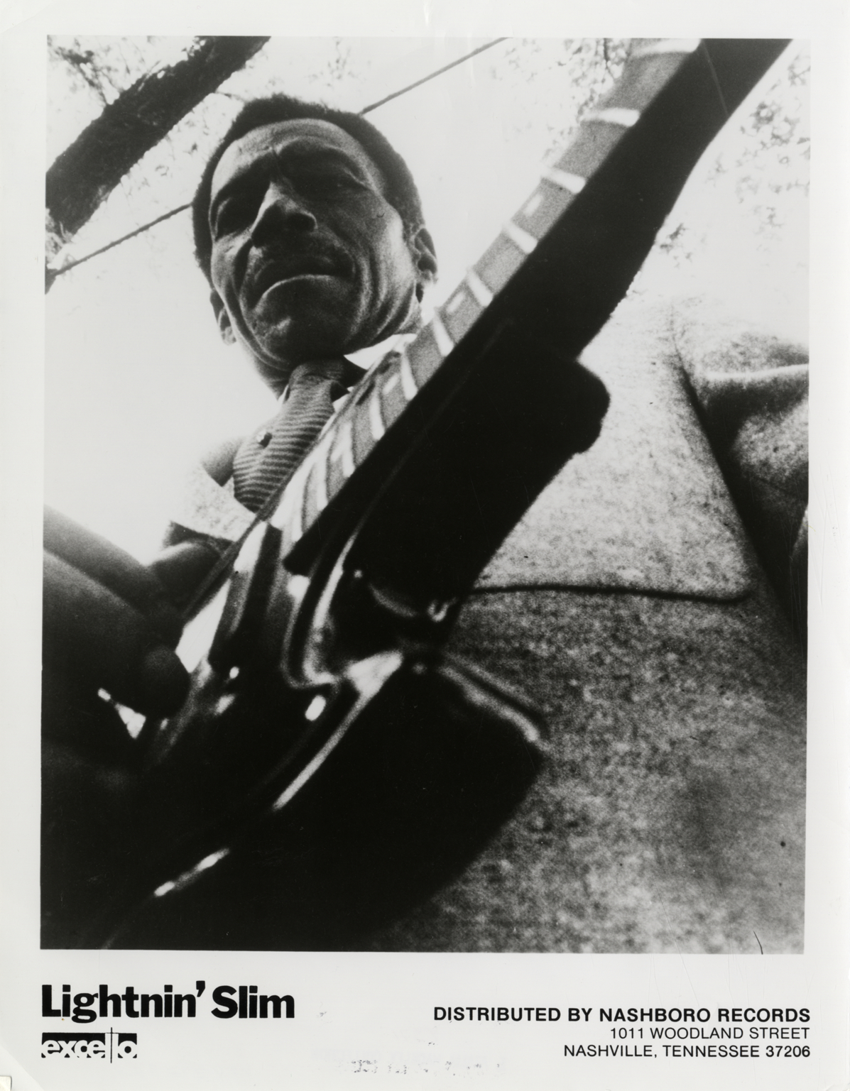 Portrait of blues singer and guitarist Lightnin' Slim. Printed on front: "Lightnin' Slim. Distributed by Nashboro Records, 1011 Woodland Street, Nashville, Tennessee 37206."