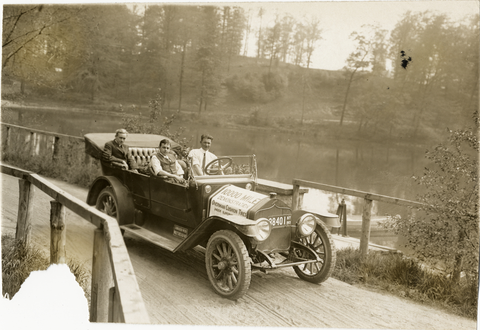View of motorists in National car crossing bridge during the 1913 Overman tires 10,000 mile demonstration. The car was outfitted with a set of Overman cushion tires and driven over different routes and road surfaces within a 50 mile radius of New York, New York. Stamped on back: "Spooner & Wells, Inc., photographers, 1931 Broadway, N.Y. City, phones 3472-3473 Col." Handwritten on back: "Tours--Overman tires 10,000 mile demonstration, 1913."