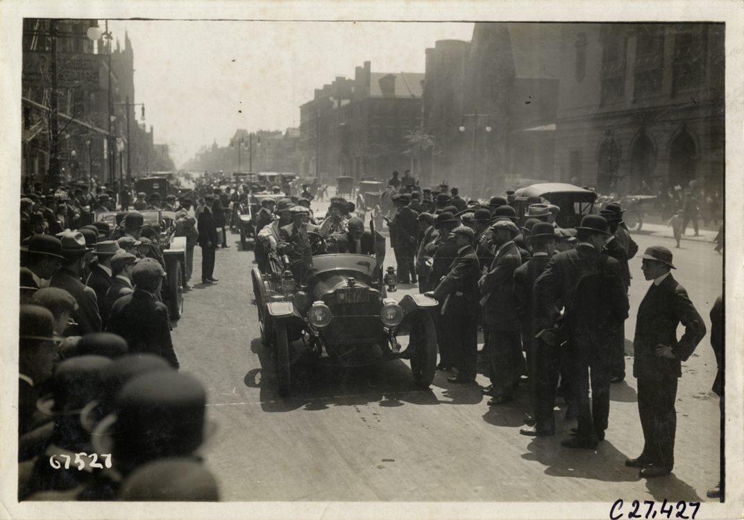 View of spectators surrounding motorists in White car at Philadelphia, Pennsylvania during the 1911 Quaker City Motor Club Roadability Run. The endurance contest covered a route from Philadelphia, Pennsylvania to Atlantic City, New Jersey. Stamped on back: "Spooner & Wells, Inc., photographers, telephones 3472-3473 Columbus, 1931 Broadway, New York." Handwritten on back: "White gas car, start, [undecipherable]. Tours--Quaker City Motor Club Roadability Run, 1911."