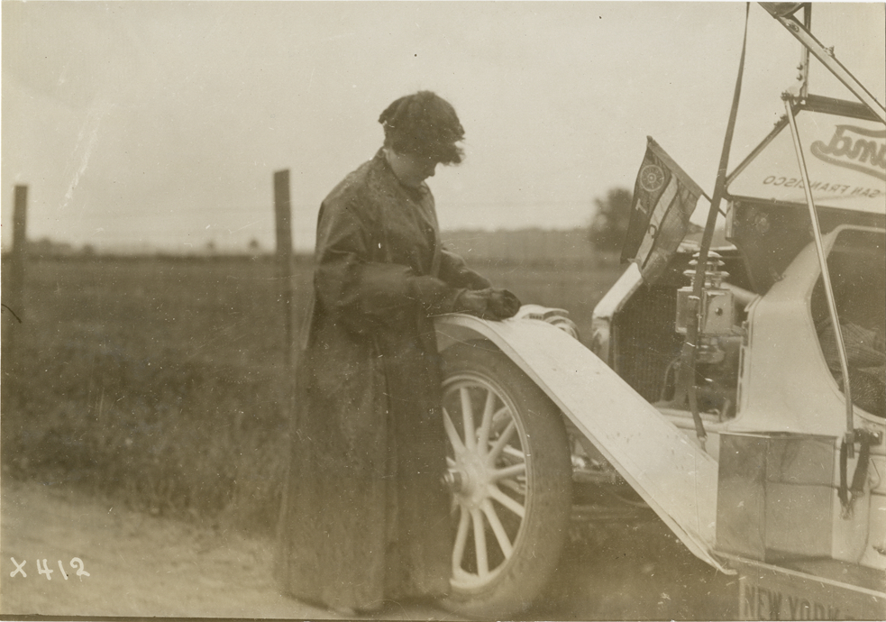 View of Blanche Stuart Scott standing next to Overland car during the 1910 New York to San Francisco tour. The promotional cross-country tour was sponsored by the Willys-Overland Company. Stamped on back: "Spooner & Wells, Inc., photographers, telephone North 1745. 1231 Woodward Ave., Detroit, Mich. Detroit, 1231 Woodward, New York, 1931 Broadway." Handwritten on back: "Tours--New York to San Francisco, 1910."