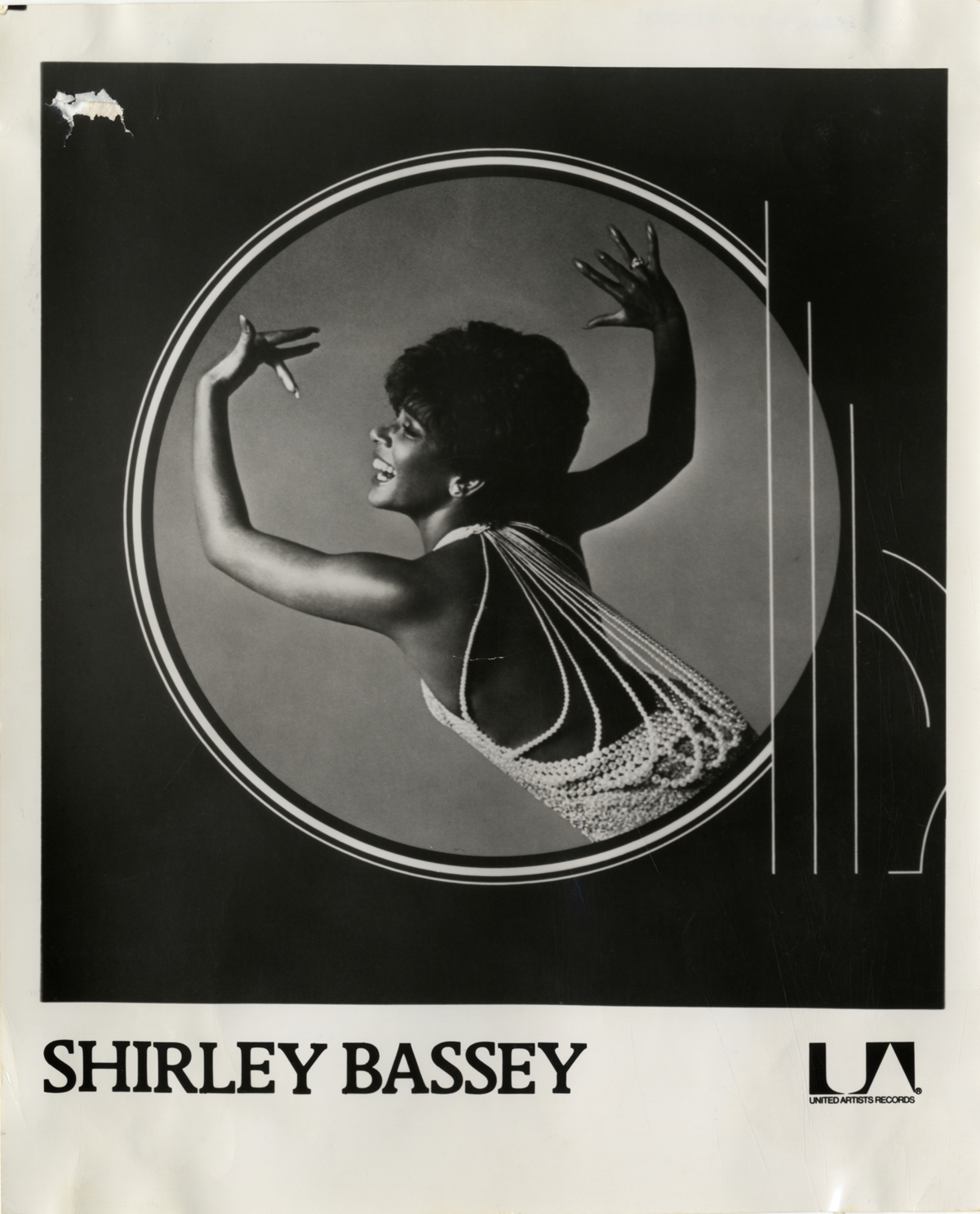 Portrait of singer Shirley Bassey. Printed on front: "Shirley Bassey. United Artists Records."