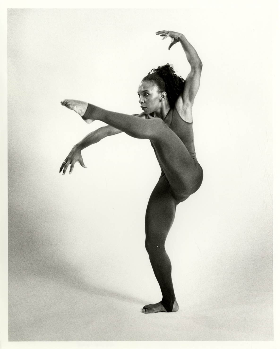 Portrait of dancer Linda Spriggs performing in "The griot." Label on back: "Dancer, Linda Spriggs in 'The griot,' choreographed by Pearl Primus."