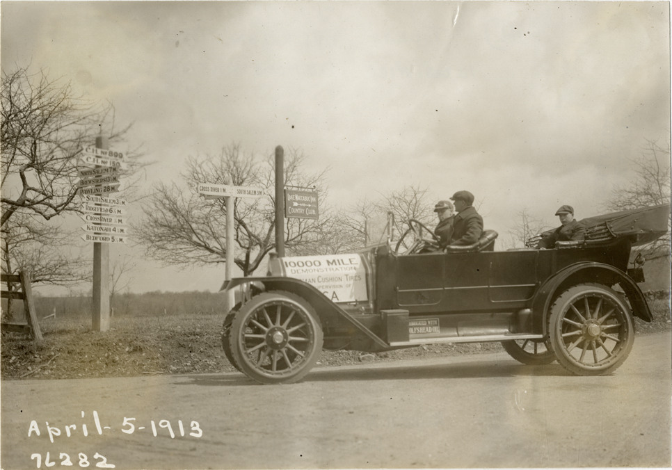 View of motorists in National car stopping at roadside mileage and directional signs during the 1913 Overman tires 10,000 mile demonstration. The car was outfitted with a set of Overman cushion tires and driven over different routes and road surfaces within a 50 mile radius of New York, New York. Printed on front: "April-5-1913." Stamped on back: "Spooner & Wells, Inc., photographers, 1931 Broadway, N.Y. City, phones 3472-3473 Col." Handwritten on back: "Tours--Overman tires 10,000 mile demonstration, 1913."
