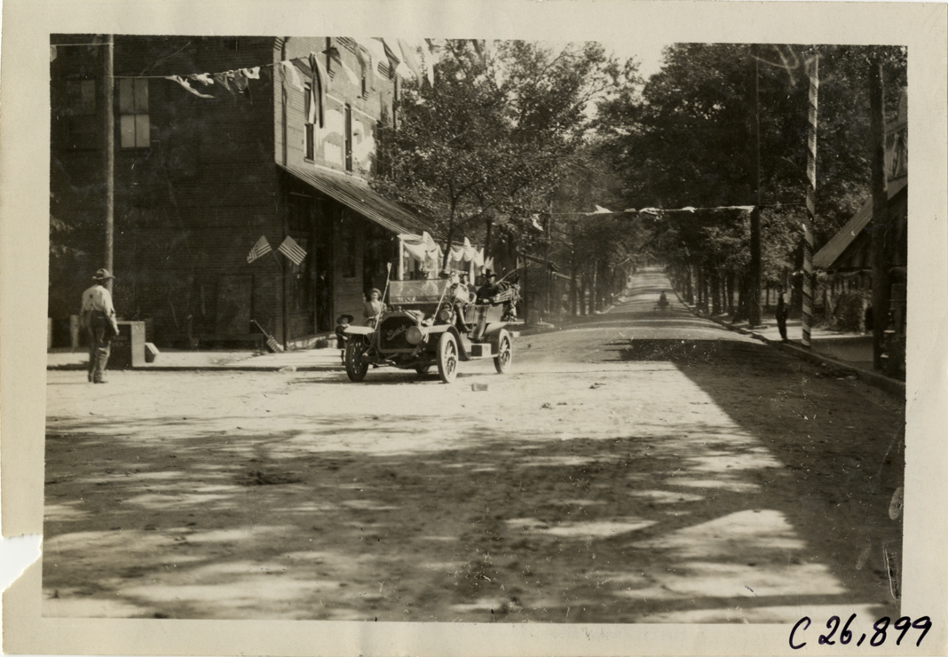 View of motorists in Buick car at Decatur, Georgia during the 1909 New York to Atlanta Good Roads Tour. Flags are suspended over street; commercial buildings in background. Stamped on back: "Photo by Spooner & Wells, Inc. 1931 Broadway, N.Y." Handwritten on back: "Tours--New York-Atlanta Good Roads Tour, 1909."