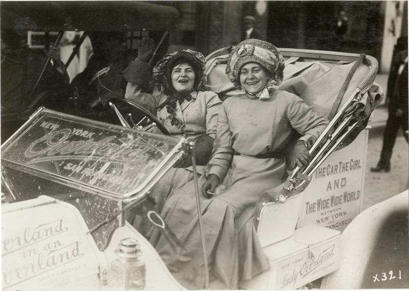 View of Blanche Stuart Scott and Miss Phillips posing in Overland car during the 1910 New York to San Francisco tour. The promotional cross-country tour was sponsored by the Willys-Overland Company. Stamped on back: "Spooner & Wells, Inc., photographers, telephone North 1745. 1231 Woodward Ave., Detroit, Mich. Detroit, 1231 Woodward, New York, 1931 Broadway." Handwritten on back: "Miss Scott, Miss Phillips. Tours--New York to San Francisco, 1910."