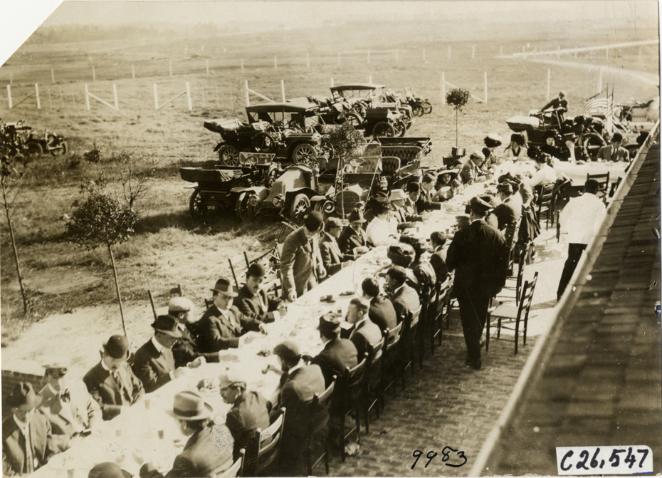 Motorists dining outdoors at long table, 1909 New York-Atlanta Good Roads Tour