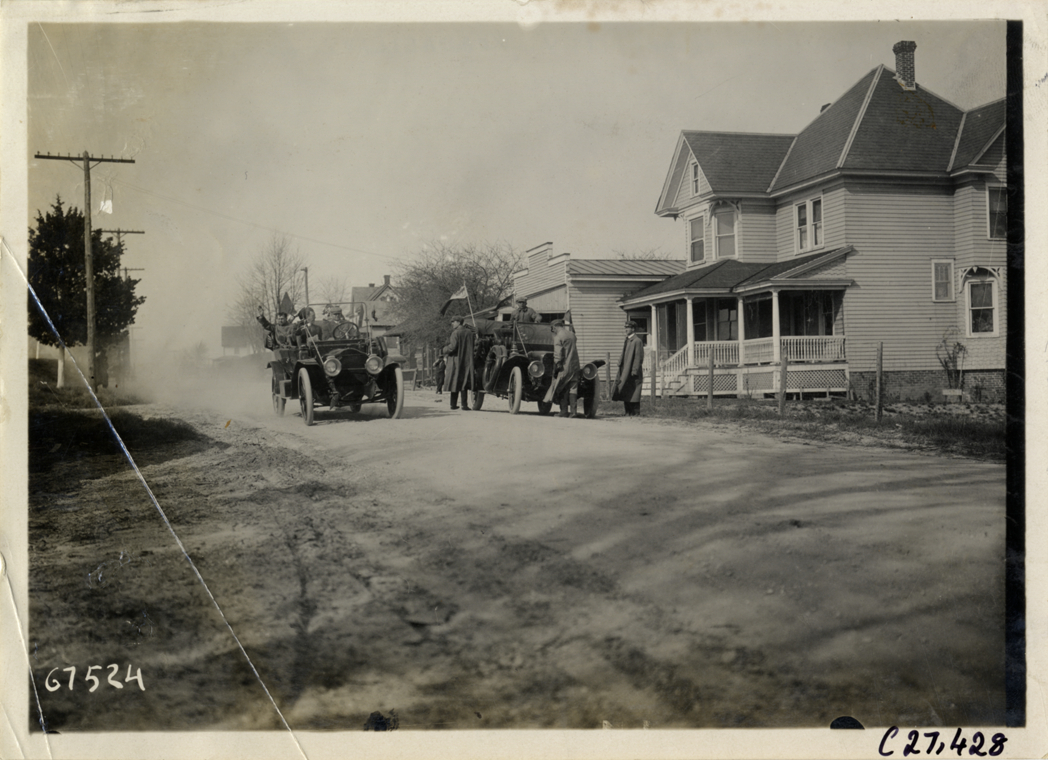View of White car and unidentified car near Oceanville, New Jersey during the 1911 Quaker City Motor Club Roadability Run. Wooden-frame house and garage on right. The endurance contest covered a route from Philadelphia, Pennsylvania to Atlantic City, New Jersey. Stamped on back: "Spooner & Wells, Inc., photographers, telephones 3472-3473 Columbus, 1931 Broadway, New York." Handwritten on back: "[undecipherable] road near Oceanville, a White gas car #9 [undecipherable] driven by Evans Church. Tours--Quaker City Motor Club Roadability Run, 1911."
