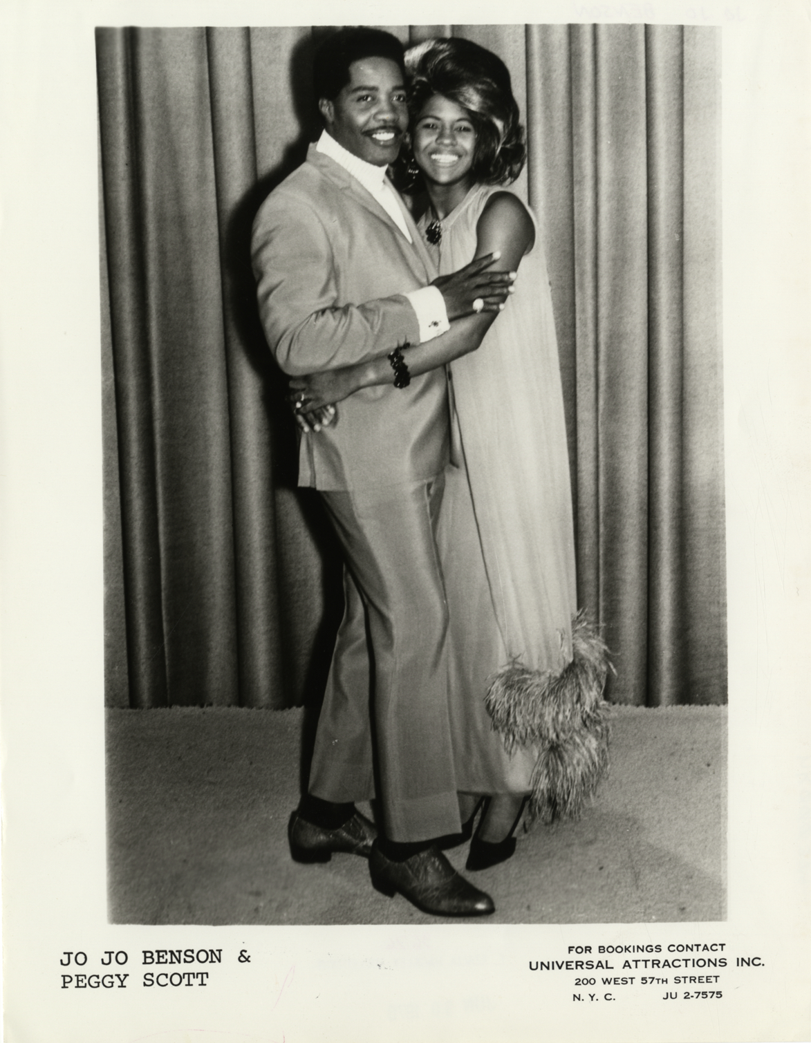 Portrait of singers Jo Jo Benson and Peggy Scott. Printed on front: "Jo Jo Benson & Peggy Scott. For booking contact Universal Attractions Inc., 200 West 57th Street, N.Y.C., JU 2-7575." Handwritten on back: "Jo Jo Benson."